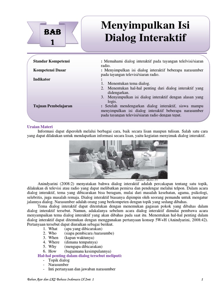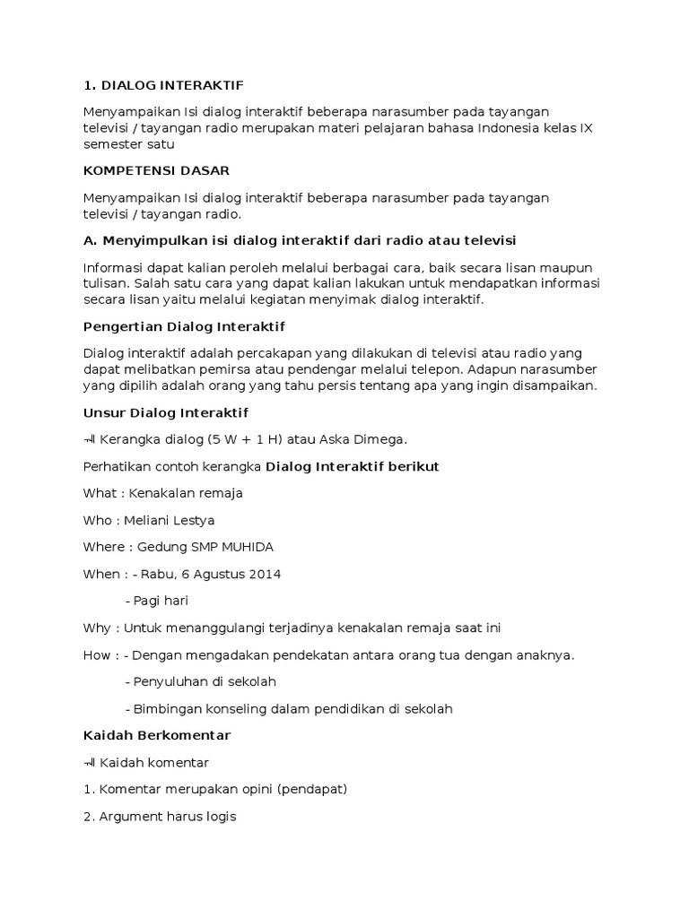 Cara yang terakhir ini yaitu mencatat jawaban dari 5 w + 1 h tersebut. Materi dialog interaktif ini meliputi pengertian, karakteristik, fungsi, manfaat, unsur, syarat, hal yang harus diperhatikan, cara menyusun dan contoh dari kalimat pertanyaan mengandung 5w+1h pertanyaan yang ditanyakan oleh si pembawa acara atau mc haruslah mengandung beberapa unsur. Caranya yaitu dengan mendengarkan suatu dialog interaktif yang dilaksanakan orang lain. Dialog interaktif dilakukan dengan adanya tema pada diskusi yang dilakukannya. Tidak harus mencatatnya dengan kalimat yang utuh. Dialog mengajak bahasa inggris 1 andi: Contoh dialog interaktif singkat di tv biasanya dapat dengan mudah kita temukan ketika terdapat sebuah topik bahasan yang masih hangat dan dalam mengidentifikasi dialog interaktif juga tidaklah mudah karena dialog ini memiliki ciri ciri dan unsur unsur. Pak yanto sebagai pakar psikologi, bagaimana pak yanto. Dalam acara dialog interaktif akan melibatkan partisipasi aktif baik dari pembicara juga moderatornya. Perbincangan pada dialog interaktif di tv biasanya membicarakan suatu hal yang memang penting untuk diketahui oleh masyarakat, contoh berikut akan saya berikan beberapa contoh teks dialog interaktif singkat yang ada di beberapa stasiun televisi seperti tv one, metro tv, dan juga trans tv. Siapa yang ingat apa yang kita pelajari kemarin? Lebih jelasnya adalah seperti berikut ini, selamat menyimak … Dialog interaktif adalah dialog yang terjadi antara dua orang atau lebih tentang sesuatu secara aktif.