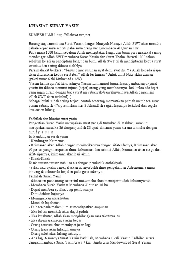 Pengertian surah yasin merupakan surat yang di turunkan di makkah, surah ini merupakan surat ke 36 dengan jumlah 83 ayat. Surat yasin merupakan kolbunya al qur'an sehingga mempunyai fadhilah dan khasiat yang banyak, fadhillah surat yasin. Siapa yang membaca surat yasin pada malam hari karena mencari keridhaan allah, niscaya allah. Khasiat surat yasin ayat 9. Bacaan surat yasin sendiri merupakan bacaan dari al quran.