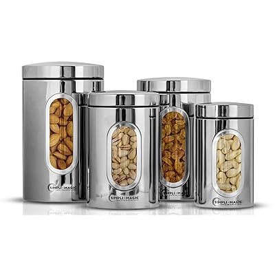 5 out of 5 stars. Qualways jumbo stainless steel kitchen canister set of 4 (set of 4), 6.5 lb, 5 lb. Airtight lids keep ingredients fresh and safe from pests. Get 5% in rewards with club o! 4.1 out of 5 stars with 24 ratings. Canister set, cast ceramic jars, stainless steel lids and spoon measures, free shipping, only 59.99 each set. Airtight lids help keep contents fresher, longer. Get it as soon as tue, aug 17. Convenient windows allow you to check contents and supply level easily, perfect for storing coffee, nuts, sugars and more. Home basics 4 piece essence collection stainless steel canister set. 2.3 out of 5 stars with 4 ratings. Glass canisters with airtight lids window set of 4 stainless steel for kitchen. Sure the store is locked but what good is that the sugar eaters are inside with the candy!